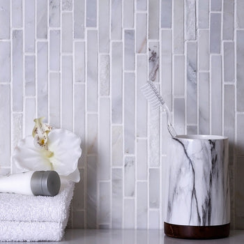 Admired for a clean-lined profile, KitKat marble tile bathroom idea delivers an awe-inspiring modern sensibility. And yes, this slender White 11.6 in. x 12 in. Linear Polished Marble Mosaic Tile can be laid in a horizontal or vertical straight stack pattern.