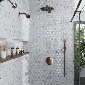 Marble bathroom mosaics provide versatility in unique ways. Choose a hexagon or penny tile pattern to set shower niches apart from your wall design.