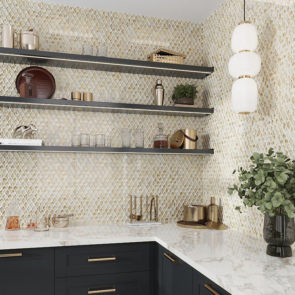 E. Fish scale Tile Pattern: Also known as scallop tile or mermaid tile pattern that makes your space stand tall out. Resembling the overlapping scales of a fish, this pattern brings motion and fluidity to your spaces. These mesh-mounted mosaics in glossy glass material can be used in patios, backsplashes, and fireplace surrounds.