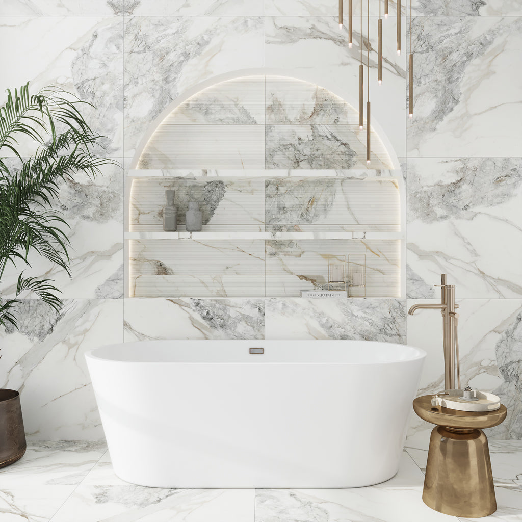 Our White with Gray-Gold 24x48 Polished Porcelain Large Format Tile beautifully mimics the luxurious look of natural marble. This large-format gray and white kitchen, spacious 24x48 inch size, reduces grout lines for a smoother and roomier appearance. This sleek look accentuates the sense of modernity and space in a gray and white kitchen. In a high-traffic area like the kitchen, fewer grout lines also translate into less upkeep, which is always advantageous!