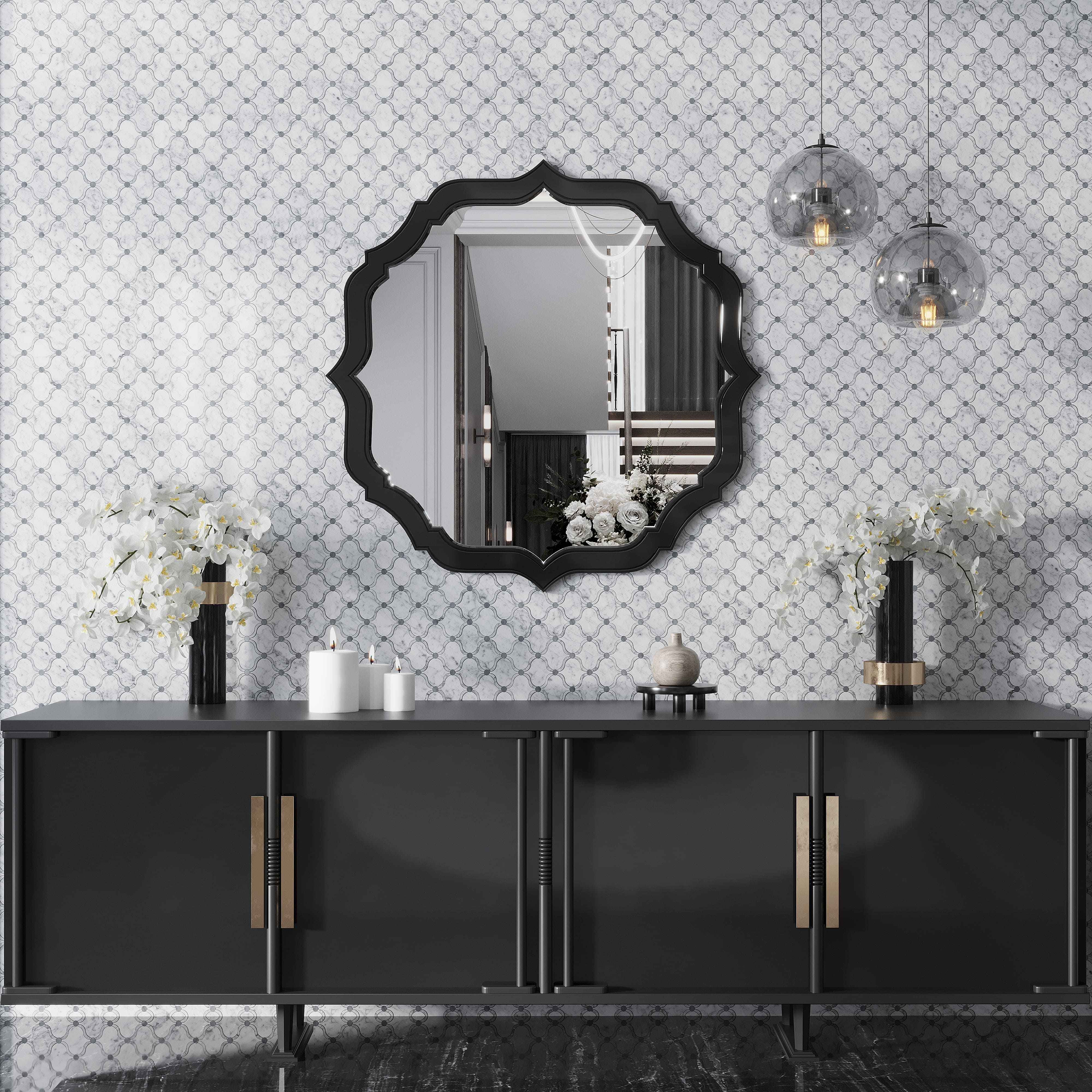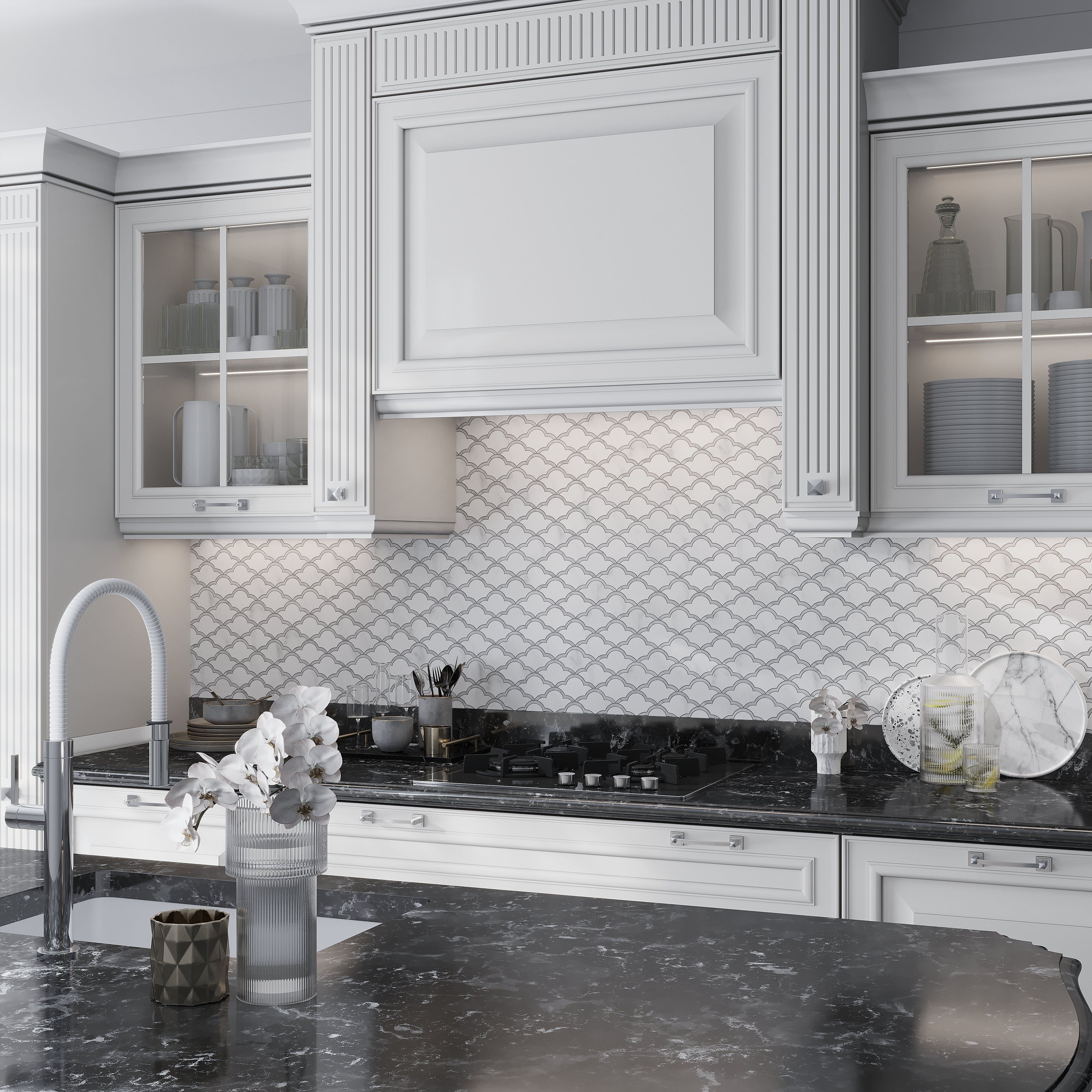 Our Soft White Smoky Gray 12x12 Polished Floral Marble Mosaic Tile is more than just a surface; it's a work of art, a mesmerizing weaving of interlocking quatrefoils and stylish curves that invites you to reinvent your kitchen. This modern white and gray kitchen design is about creating an experience, a background that subtly transforms ordinary moments into something genuinely remarkable, not just about tiling a wall.