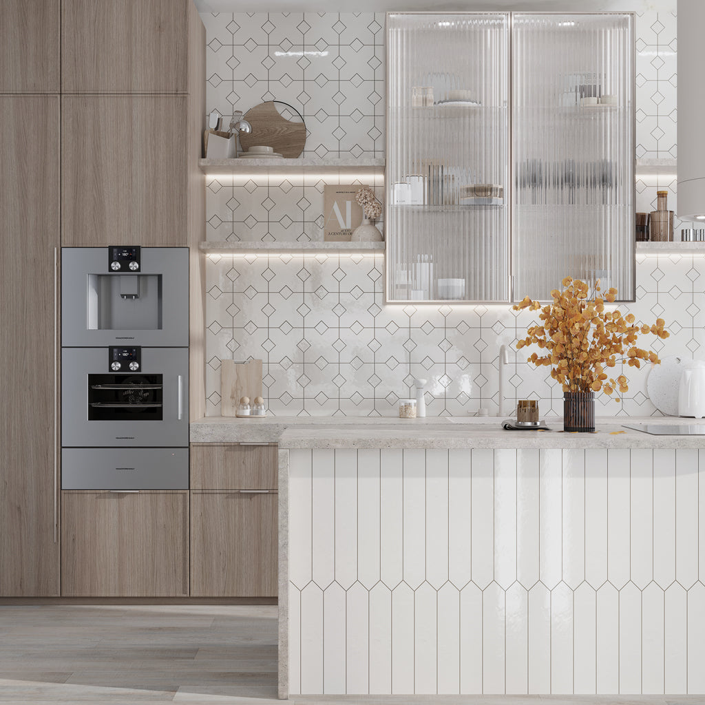 A modern and beautiful appearance is provided by the stunning elongated diamond or "lantern" shape. This modern white and gray kitchen designs adds visual interest and a feeling of movement, breaking the norms of traditional squares of rectangular tiles. This wall tile would look fantastic as a backsplash in the kitchen. Behind the stove or along the countertops, a geometric layout would serve as the focal point, bringing personality. While the gray would offer a grounding element, the lighter white would brighten the space.