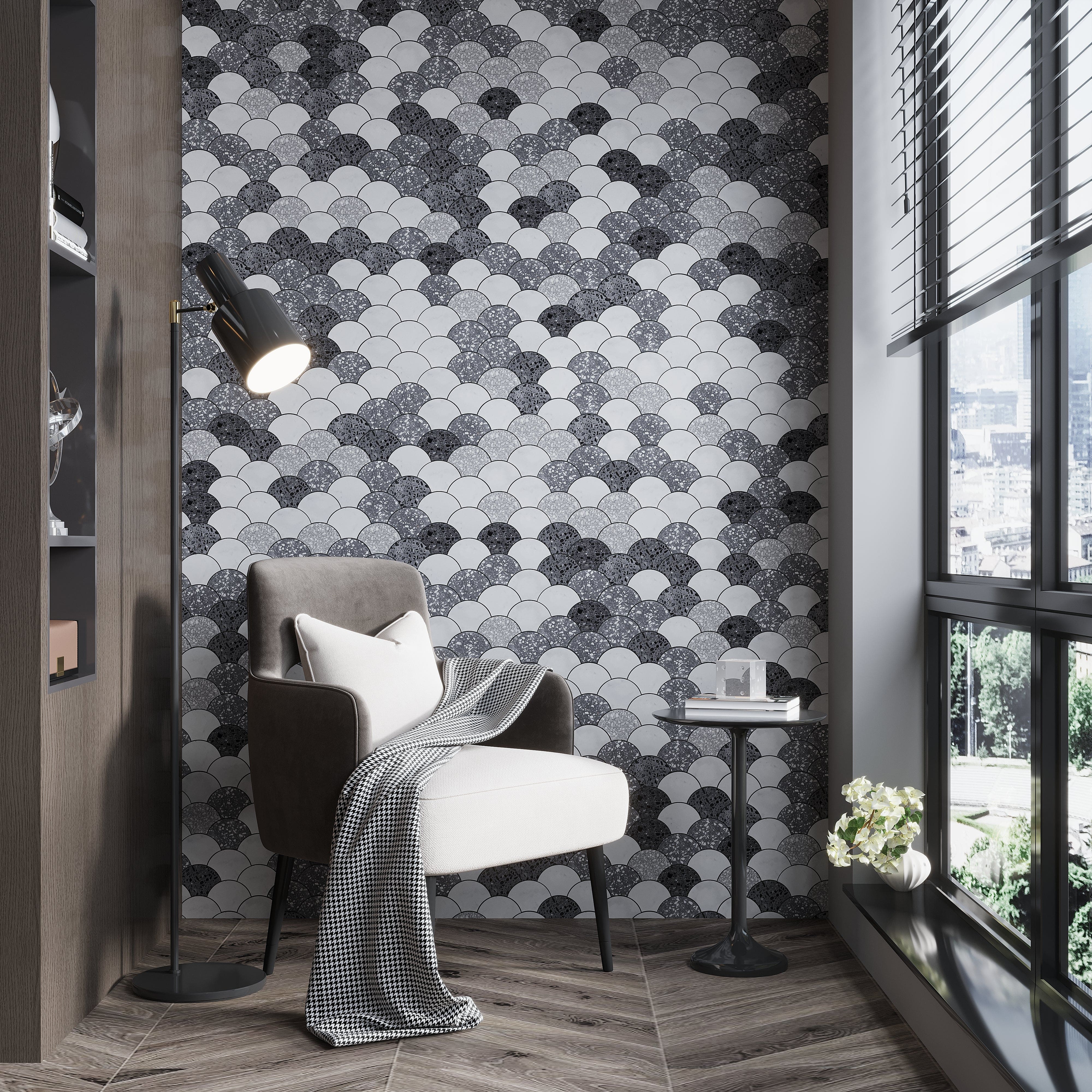 The unique fish scale shape is the distinct element that will spotlight the kitchen backsplash. Unlike conventional rectangle or square tiles, which are unchanging, its organic, flowing curves add a pleasing softness and an alluring sense of motion to the surface. This fish scale tile pattern on a kitchen backsplash does more than just add style; it draws attention and becomes a captivating focal point behind the stove or an uninterrupted visual treat along the countertops. Because its gray and white color scheme is so adaptable, it can be used with almost any kitchen style. It goes well with a variety of countertop areas and cabinet colors, including white, gray, and natural wood.