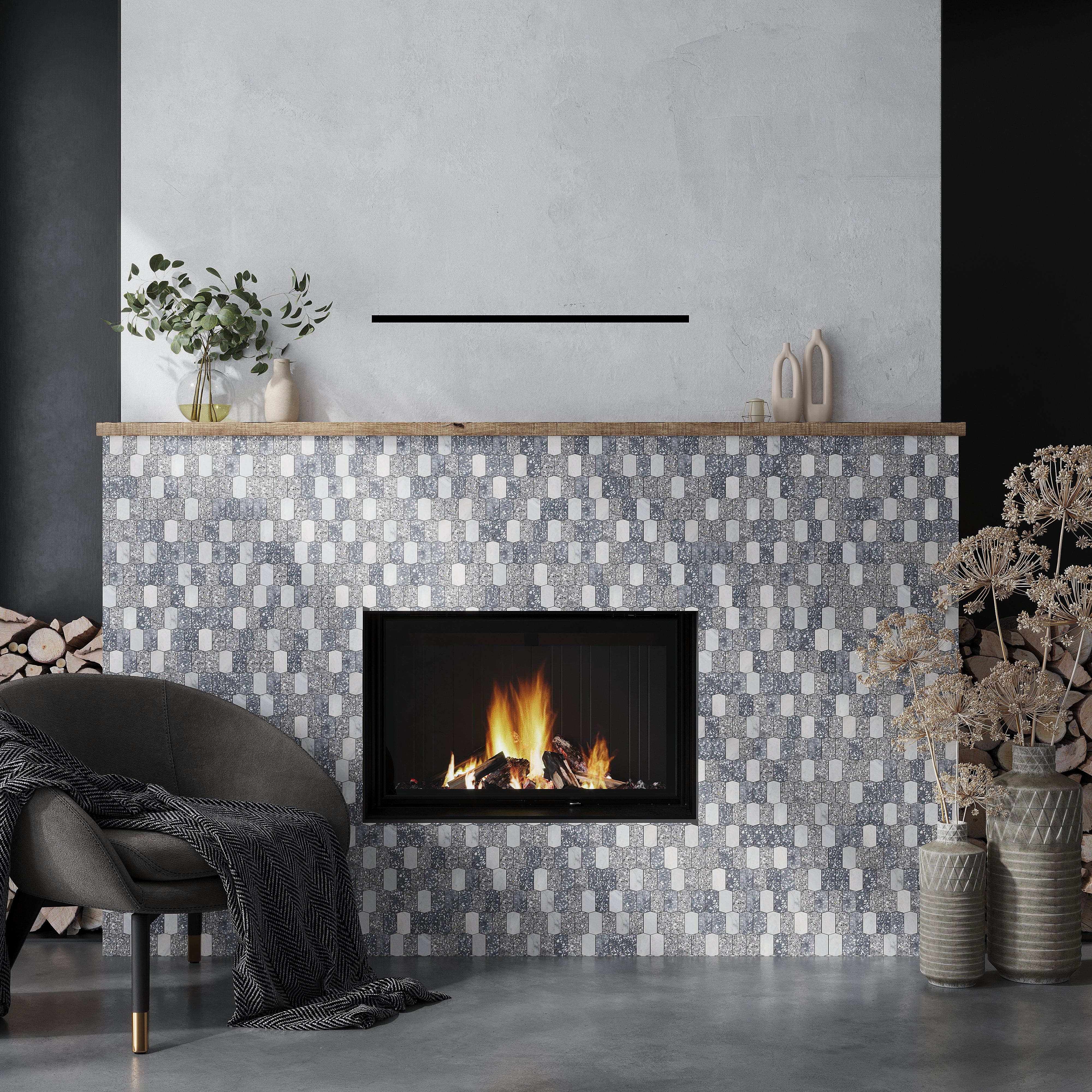 The Charcoal Gray White 11x13 Honed Triangle Terrazzo Marble Mosaic Tile is the ideal combination of traditional glamour and contemporary aesthetics. Its distinctive pattern promises to turn your kitchen from ordinary to extraordinary, while its sturdy marble composition guarantees longevity. Make a bold decision that will be remembered for a long time by selecting a gray and white kitchen tile that genuinely reflects sleek design.