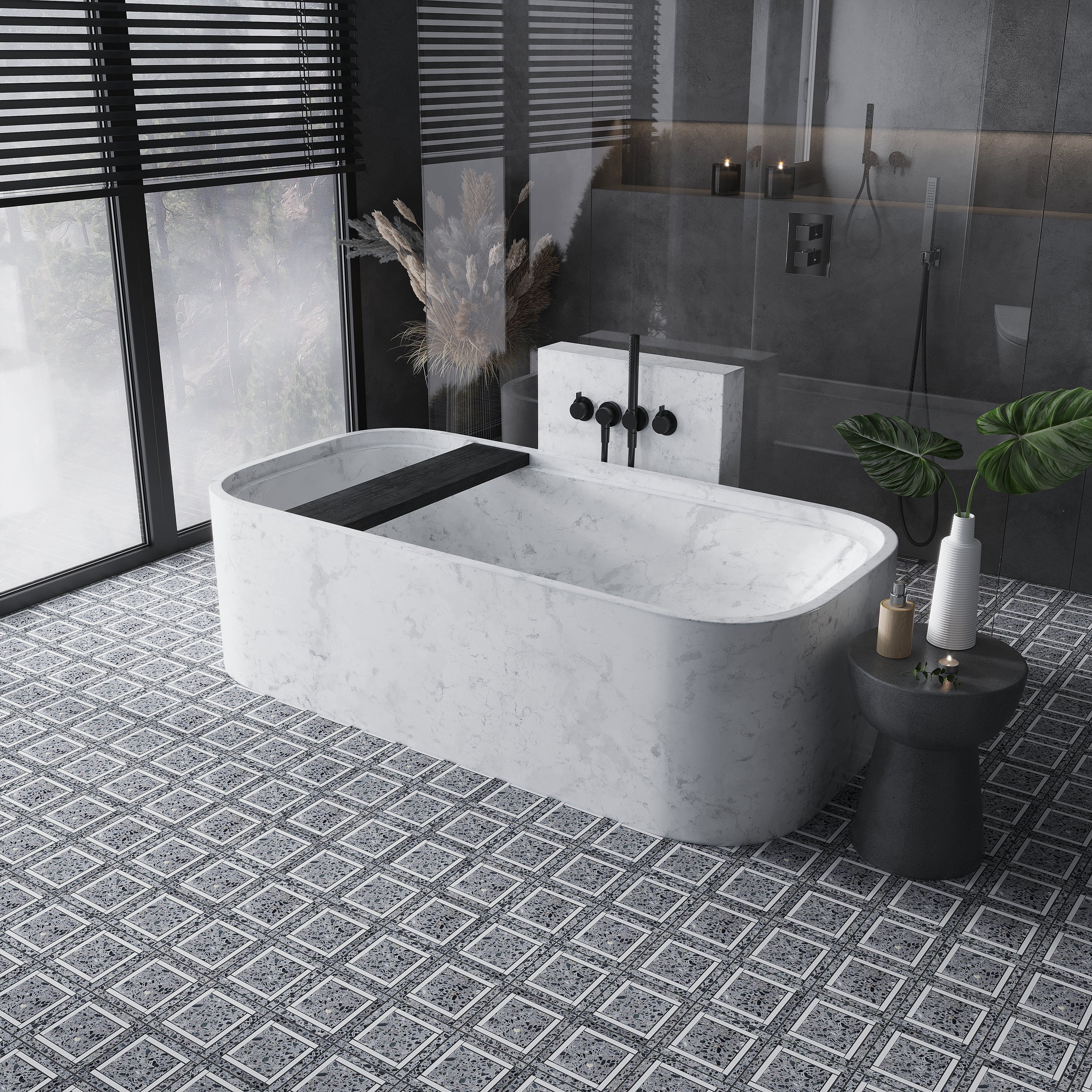Enhance the look of your kitchen space with this square shape gray and white kitchen idea. Every smaller square has a light gray terrazzo center that is surrounded by a clean white border. The border, which is made up of four different white rectangular pieces rather than a single line, provides a striking contrast to the darker gray terrazzo background that runs through the pattern.