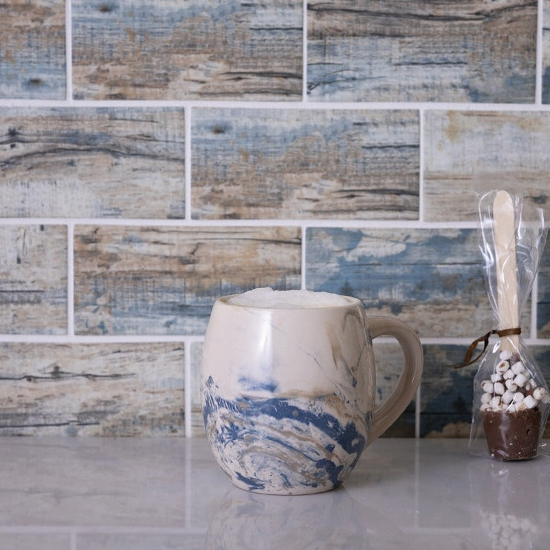 - Blue & Beige Matte Recycled Glass Subway Mosaic Tile – 11.5 x 11.5 in. is an example of waste glass transformed into a beautiful, eco-friendly surface finish. Ideal for adding a rustic touch to a country kitchen or a living room arranged in a farmhouse interior design style.