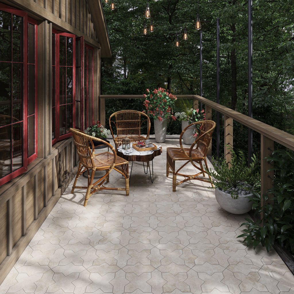 Porcelain is one of the best options when looking into outdoor kitchen tile ideas. It's tough, waterproof, and heat-resistant. Better yet, these dense and robust clay-made tiles come in various styles that mimic natural materials, such as hardwood, stone, and terracotta. With so many options available, consider our Soft Beige 6x6 Matte Cross Porcelain Tile to bring geometric flair to a tiled outdoor kitchen!