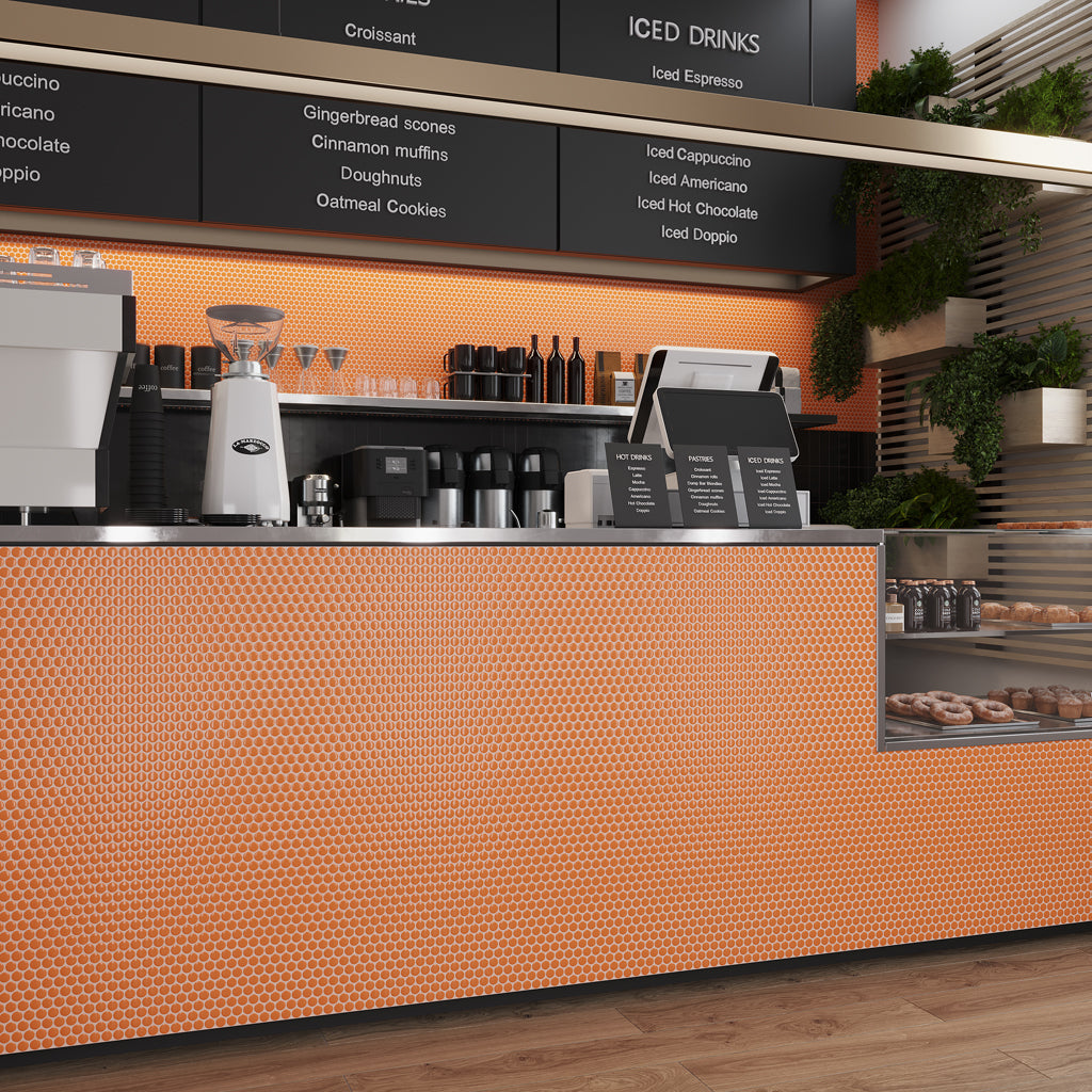 This Orange 12x12 Glossy Penny Round Porcelain Mosaic Tile is beautiful for outdoor tile design. The penny round shapes give a vintage look, while the orange hue offers a vibrant look, complementing various design styles. These durable non-slip tiles are sure to offer a playful garden and cheerful patio. They come in mesh-mounted sheets making installation a breeze.