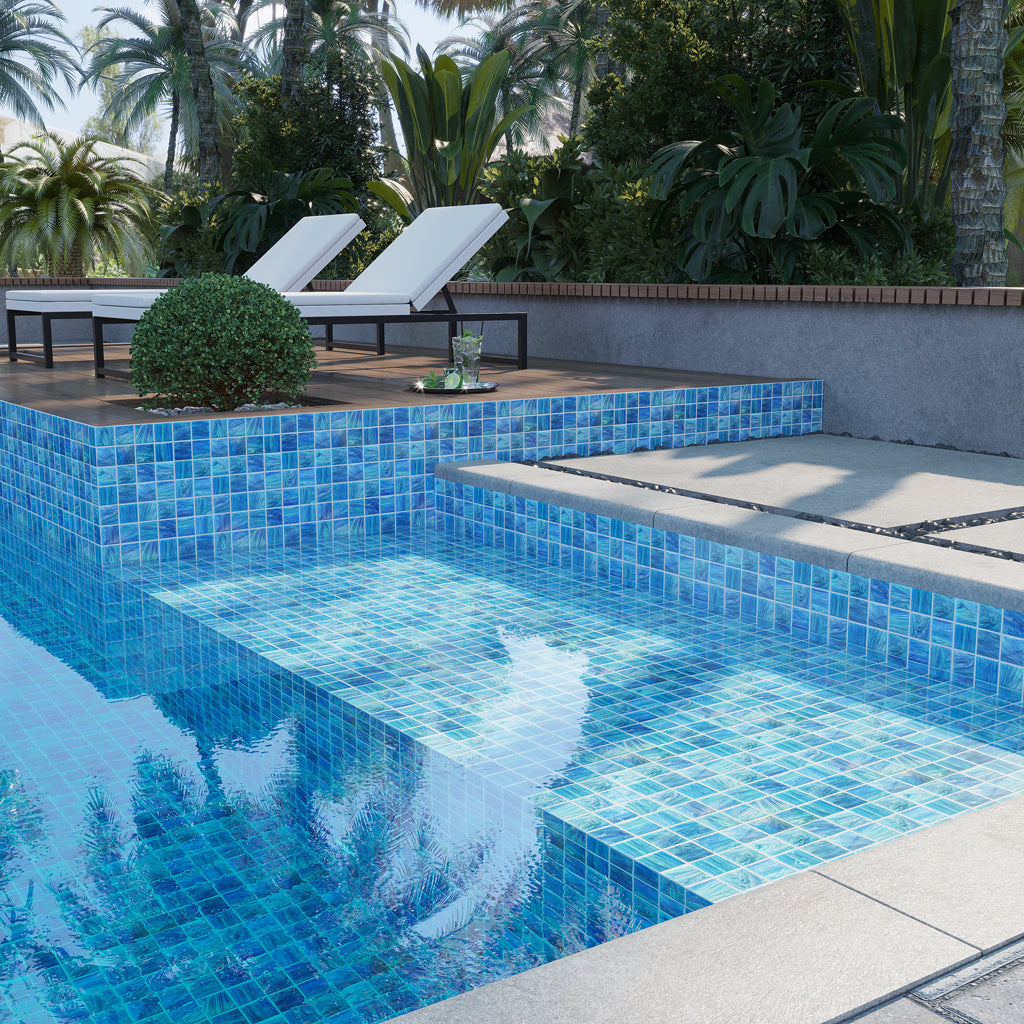 Forget plain white and beige, the future is daring and full of personality! And by that, we mean two-toned pool deck tile ideas with catchy patterns. Bold design and visual intrigue are all the rage this year, so it makes perfect sense that geometric tiles featuring contrasting colors or subtle variations of the same hue are stealing the spotlight. Think blue in its lighter and darker tones, like our Blue 6x6 Matte Square Porcelain Tile. The designs can range from minimalist to complex, offering an artistic edge to pool decks without the need for additional décor.