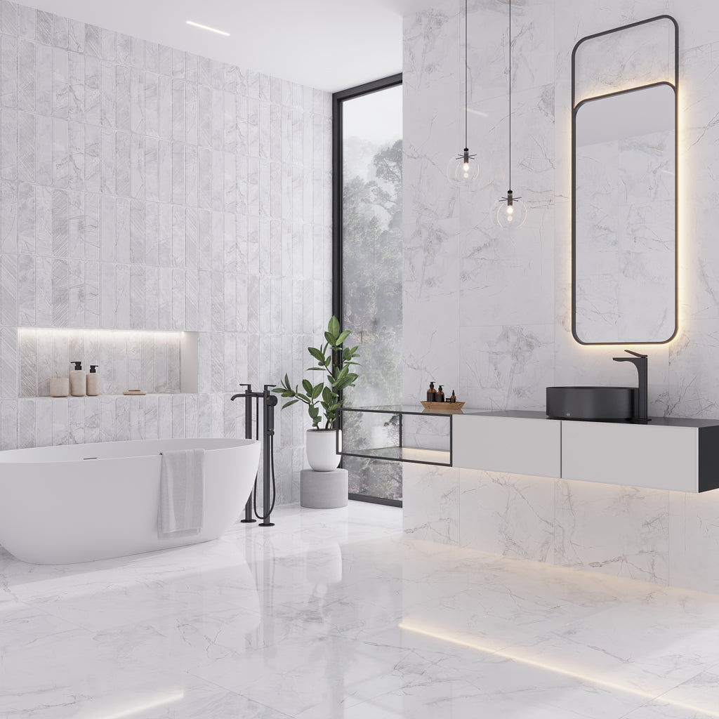 Fully customizable designs offer the freedom to work with the exact width, height, depth, and layout you want. For example, a horizontal built-in nook that stretches the length of the wall and beautifully lines up stunning tiles, like our Soft Gray White 16x48 Matte Ceramic Large Format Tile. Or a set of small inserts placed vertically to organize different bath-time essentials. Popular custom-built niche sizes include: