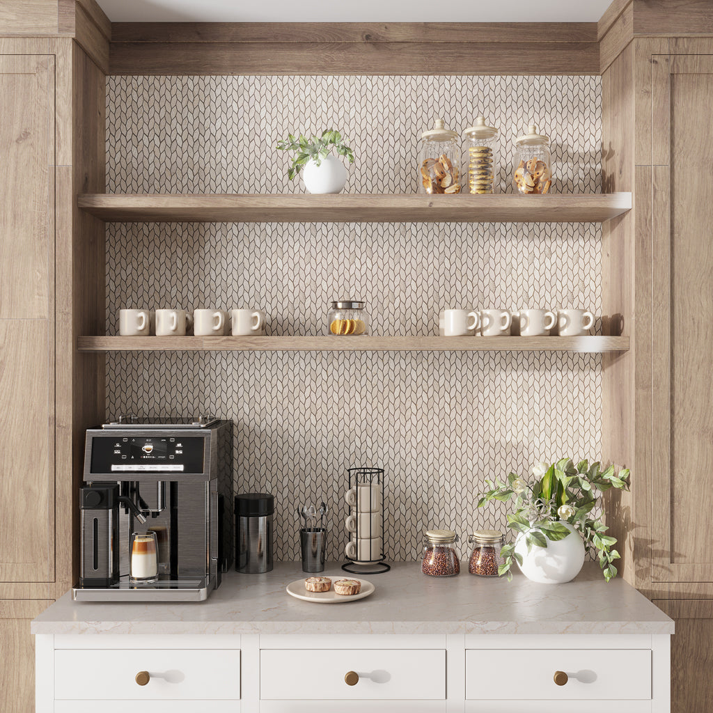 This rounded pattern will bring whimsy and flair to your walls. Scallop small kitchen tiles, such as our Wooden Beige White 9x10 Polished Fan Fish Scale Marble Mosaic Tile, add an enchanting finish. They look fantastic in coastal, bohemian, or vintage-inspired kitchen designs, and will work with any style of cabinets and countertops.