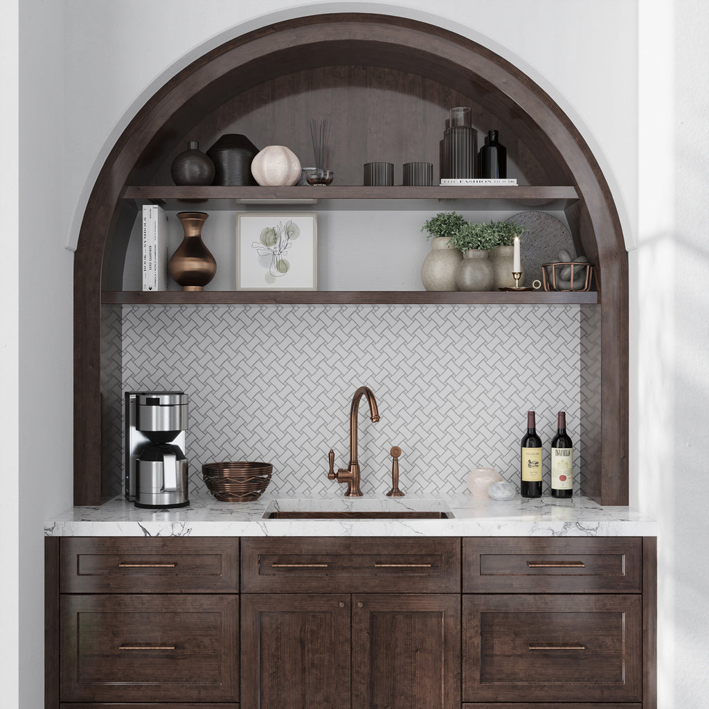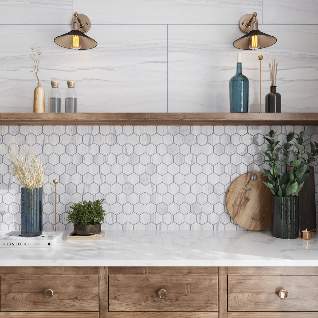 Peel-and-stick backsplash designs for kitchens are simple to install, making them suitable for renters or homeowners that want an instant upgrade. At Apollo Tile, we have a perfectly curated selection of stick-on tiles in varying styles, colors, and shapes. For instance, our White Gold 12x12 Honed Hexagon PVC Peel & Stick Tile mimics the appearance of marble. Ideal if you want small kitchen tiles that add splendor without the special upkeep. Peel-and-stick mosaics make budget-friendly makeovers possible if you do not wish to commit to standard tiles.