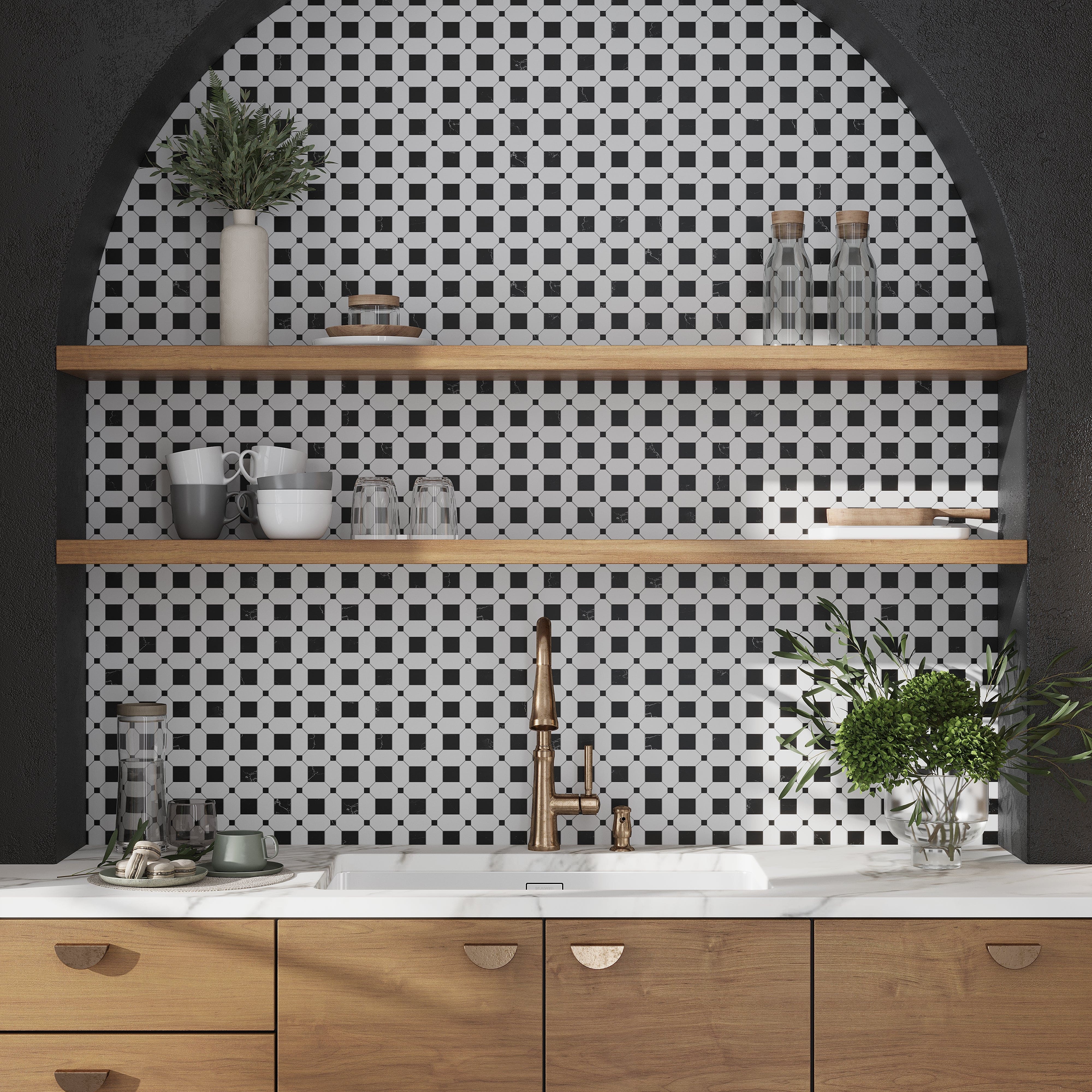Backsplash designs for kitchens with black and white tiles deliver a classic yet glamorous contrast that invites conversation. Opt for mosaics with a repeating pattern for extra drama and symmetry. Match your tiles with wooden cabinets for even more contrast. With this classic pairing of black and white, you can achieve any aesthetic you desire, from contemporary to vintage to mid-century.