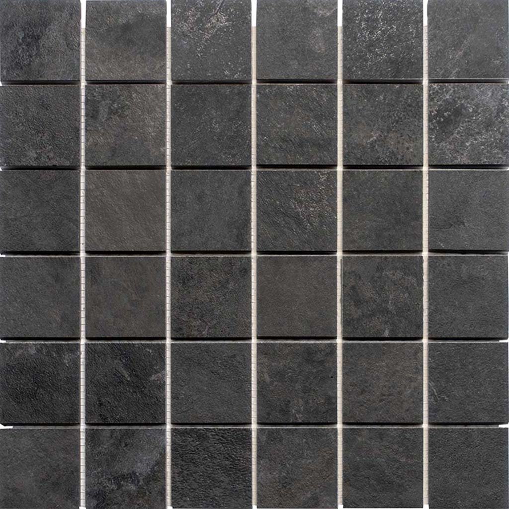Combine varying shapes and dimensions—large-format rectangles with square mosaics—using the same black color scheme. It achieves a layered, edited appearance that looks contemporary. Use our Slate Black 12x12 Matte Uniform Square Porcelain Mosaic Tile on the walls with Slate Black 24x48 Matte Porcelain Large Format Tile as flooring.
