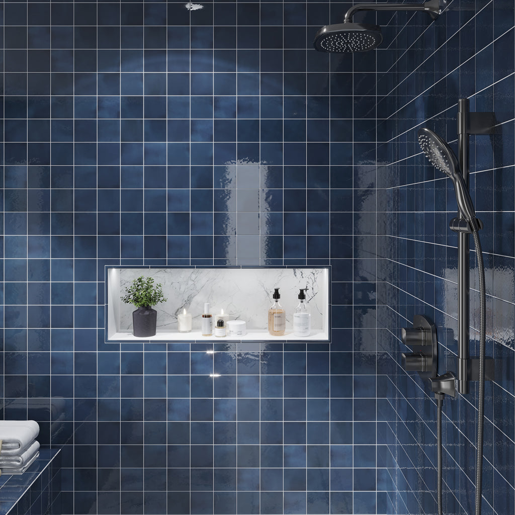 - Silken 3.94 in. x 3.94 in. Glossy Blue Ceramic Square Wall and Floor Tile showcases a stunning undulated surface that catches and reflects light. In a grid pattern, the tile’s uneven edges are accentuated to create an authentic look that standard tiles simply can’t match. Its deep blue coloring pairs nicely with white grout for a striking contrast.