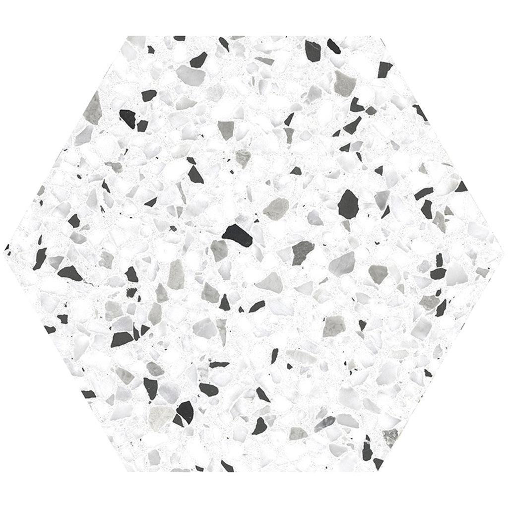 Appreciated for centuries, terrazzo is a classic material known for its beauty, durability, and ability to work in any space. Terrazzo tile is an outstanding option for shower walls and floors. Terrazzo's natural resistance to stains and moisture makes it appropriate for the shower area. This White Black 8x9 Matte Hexagon Porcelain Tile is sure to change your home decor. It is simple to clean, water-proof, and scratch-resistant tile. The true beauty of terrazzo in a shower lies in how you can make it your own.