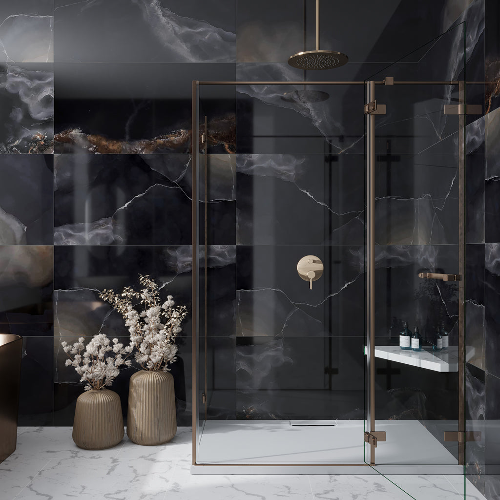 Large format walk in shower tile ideas give a flawless and expansive look, with fewer grout lines. Imagine our Black 24x48 Lappato Porcelain Large Format Tile on shower walls, offering a high-end, luxury, and minimalist feel, creating a spa-like atmosphere. Easy to clean and maintain, enhancing the overall look of the space. This rectified tile is a durable and long-lasting choice for years to come.
