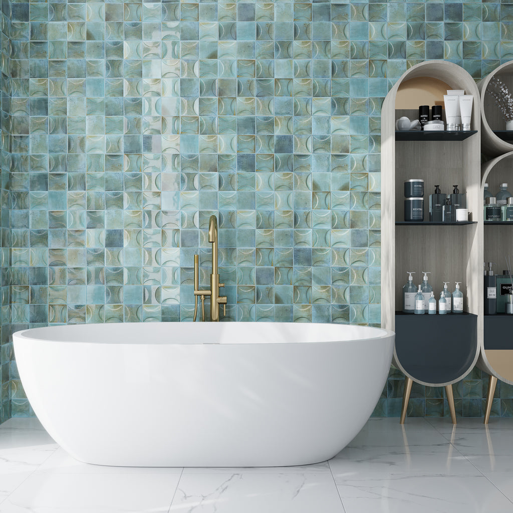 Tell a story with your shower space by installing handmade tile. Each piece is crafted imperfectly, bringing an artisanal touch to shower walls. These tiles are carefully molded, adorned, and glazed by hand, delivering exquisite, trend-setting interior designs. This Olive Green 4x4 Glossy Square Ceramic Tile offers a rustic, hand-crafted look with a blue-green glaze and delicate texture. Apollo Tile has a unique collection of handmade tile to choose from. Explore today and choose from various options for a truly personalized walk-in shower tile idea.