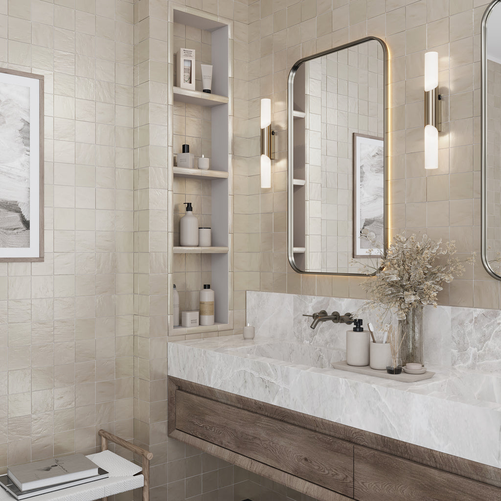 Zellige walk in shower tile ideas are a perfectly imperfect choice, bringing a Moroccan touch to the space. Every single tile is different in color, texture, and finish; this distinct characteristic makes zellige tile extraordinary. Beyond their artisanal look, zellige tiles bounce light around in a way that makes the shower feel open and effortlessly stylish. Practical too, they’re easy to clean, moisture-resistant, and made to stand the test of time. Soft and calming, the Light Tea Green 4x4 Glossy Matte Subway Tile adds timeless charm and everyday durability to any shower.