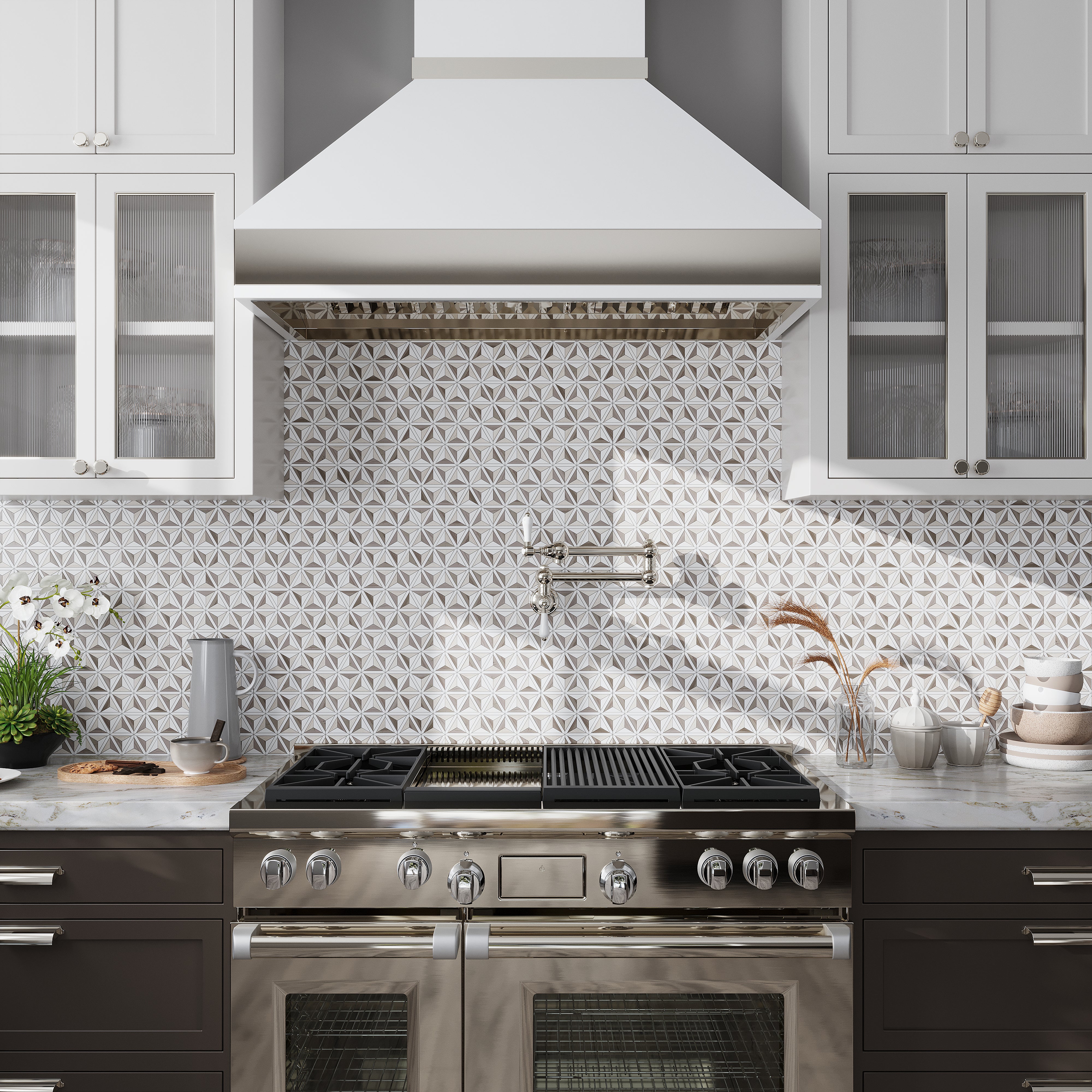 A backsplash is a vertical tiled surface commonly installed behind the sink or stove, between upper and lower cabinets, or above prep areas. Its purpose is both functional and aesthetic. Most utilitarian rooms, be it the powder room, kitchen, wet bar, or laundry room, have a tile backsplash working overtime in the background to defend walls from everyday messes. But with an incredible array of materials, textures, and sizes, it can just as well take center stage and become the room’s focal point. Learn about the types of backsplash, why it's a valuable design element, and how to choose the right kitchen or bathroom wall tile to achieve a fresh finish effortlessly.