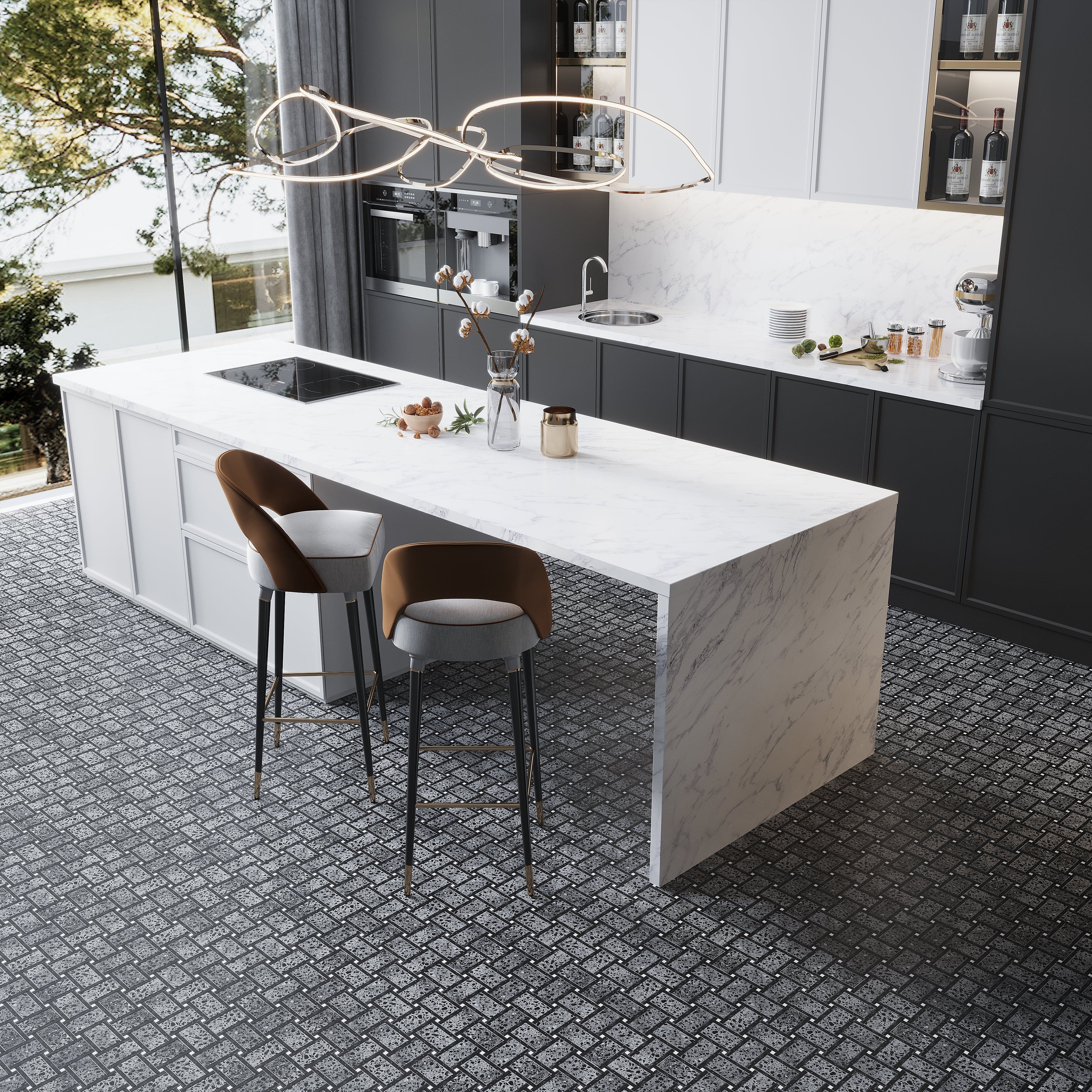 Terrazzo-look porcelain tiles work wonderfully in kitchens because they are stain-resistant and low-maintenance. They withstand spills, heat, and heavy foot traffic without compromising their designer shine.