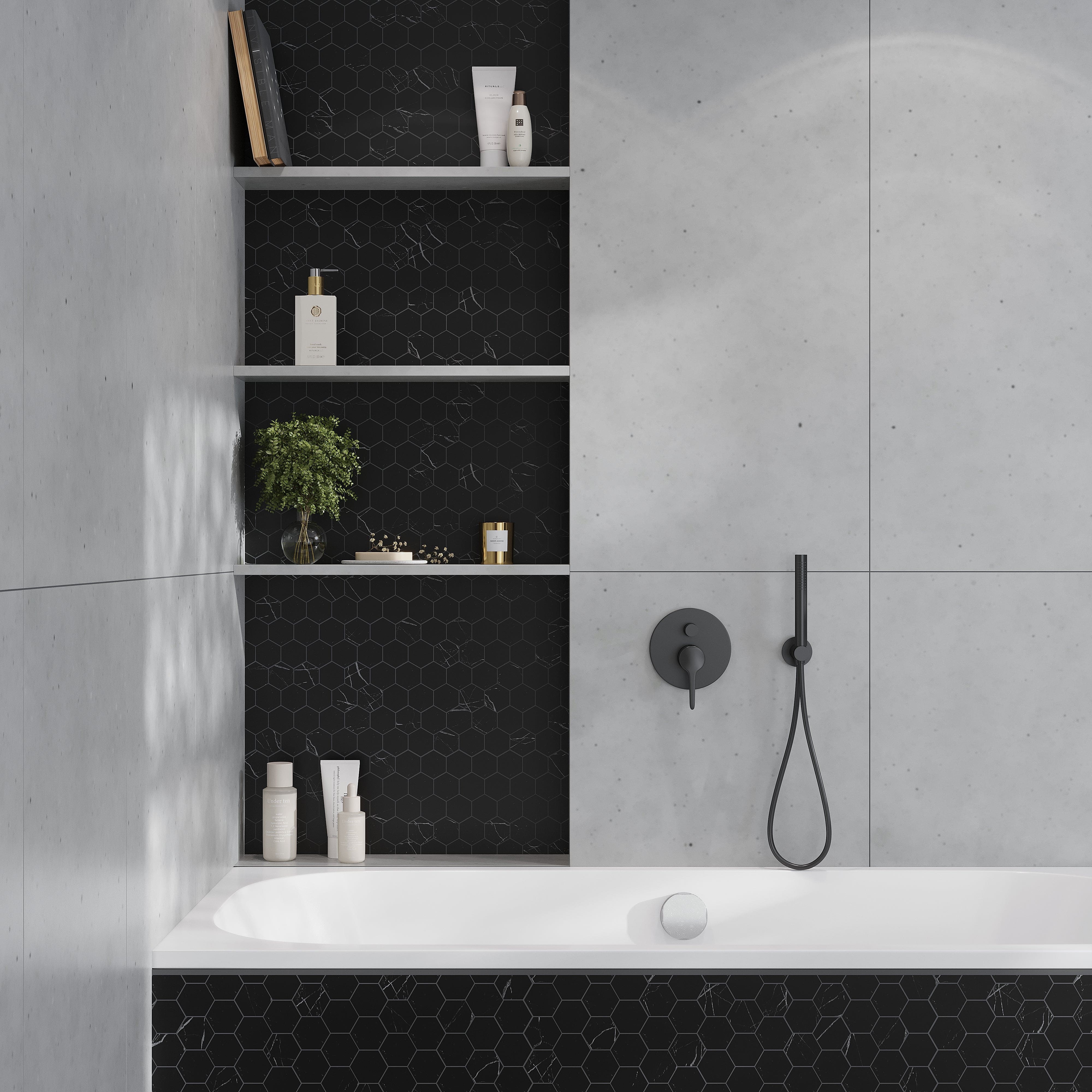 Using a full tile above and below the niche eliminates the need for small slivers or inconsistent grout lines. Inside the niche, the selected tile can match the surrounds or contrast to make it pop. For instance, our Eastern Black 12x12 Honed Hexagon Marble Mosaic Tile works well with muted, large-format surrounding tiles.