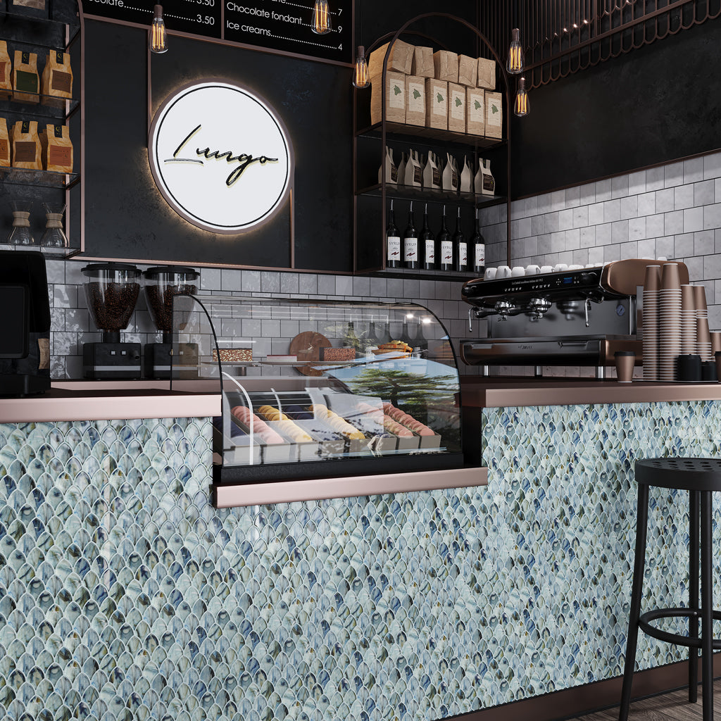 Fish scale tiles, or referred to as mermaid or scallop, impress with their whimsical shape -and are a beautiful feature for an unconventional backsplash design. In a shiny finish and ocean-inspired hues, designs like Blue 11x11 Glossy Fan Fish Scale Glass Mosaic Tile will add a sense of enchanting movement to the wall above contrast white cabinets.