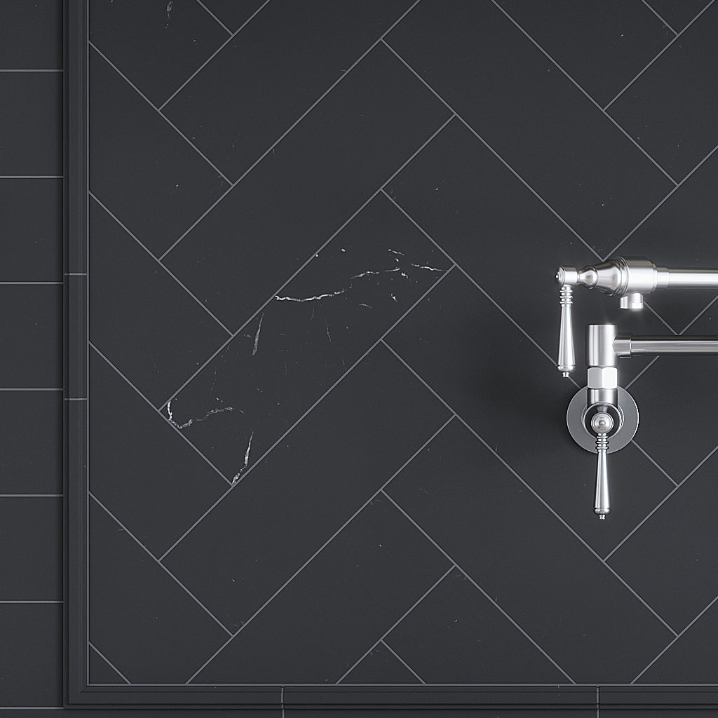 Matte black tiles create a bold contrast with white cabinetry. Use a large format tile for a streamlined appearance or penny rounds for intricate detail. Black kitchen backsplash with white cabinets can be anything you desire: contemporary, elegant, and visually rich-just as our Black 2x8 Matte Ceramic Subway Deco Tile beautifully highlights!