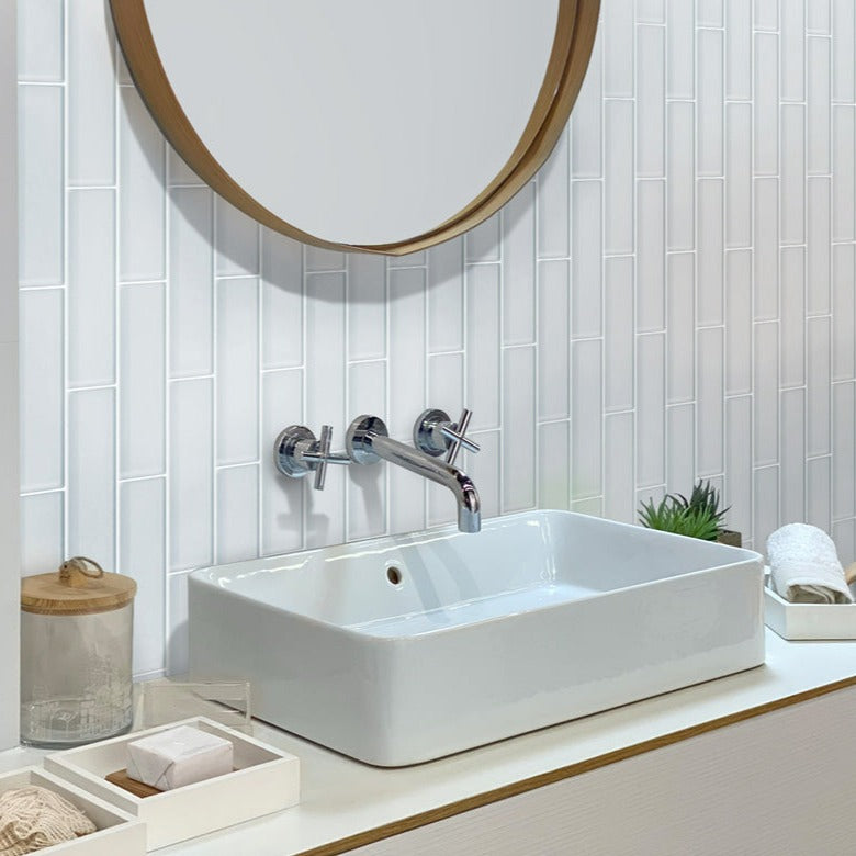 A creative option for creating a modern white tile bathroom that feels purposeful and new is a 3x12 white subway tile. Particularly in small bathrooms, its longer format helps visually stretch the walls by providing a little more length, adds structure without feeling cluttered, whether it is stacked vertically for a taller impression, laid in a traditional offset pattern, or arranged in a herringbone pattern for extra rhythm. Apollo Tile has a unique collection of 3x12 subway tiles in glass material. This White 3x12 Matte Subway Glass Tile is specifically designed for both bathroom walls and floors.