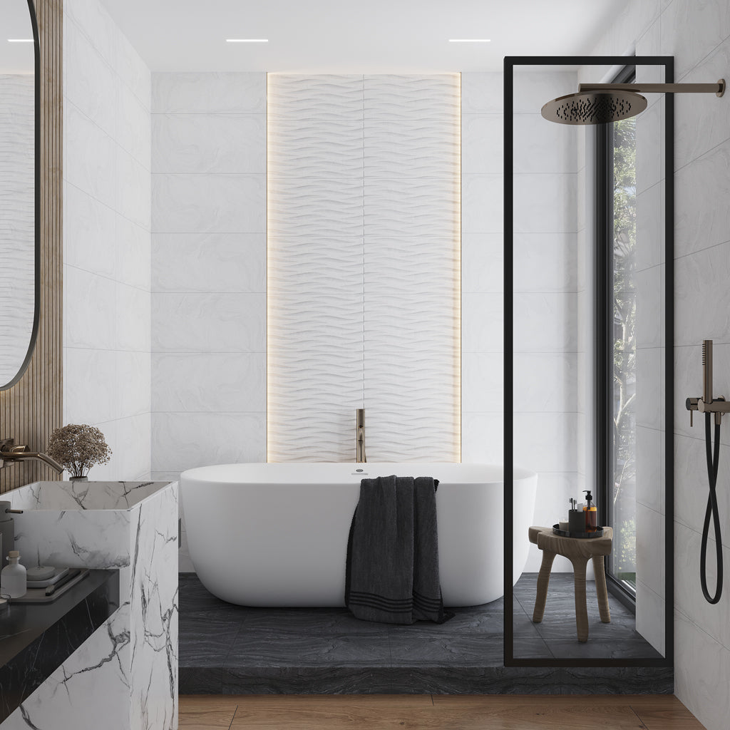 A smart and modern design choice that combines practicality and aesthetic spaciousness is the use of 12x24 tile in the bathroom. These white tile bathroom ideas work especially well in small spaces or with low ceilings because of their elongated shape, which gives the impression of more space, especially when arranged in a horizontal or vertical stack pattern. Their proportions are ideal for creating a polished, up-to-date style, whether you're mounting them on walls, floors, or within a walk-in shower. Apollo Tile has a unique collection of this 12x24 tile.