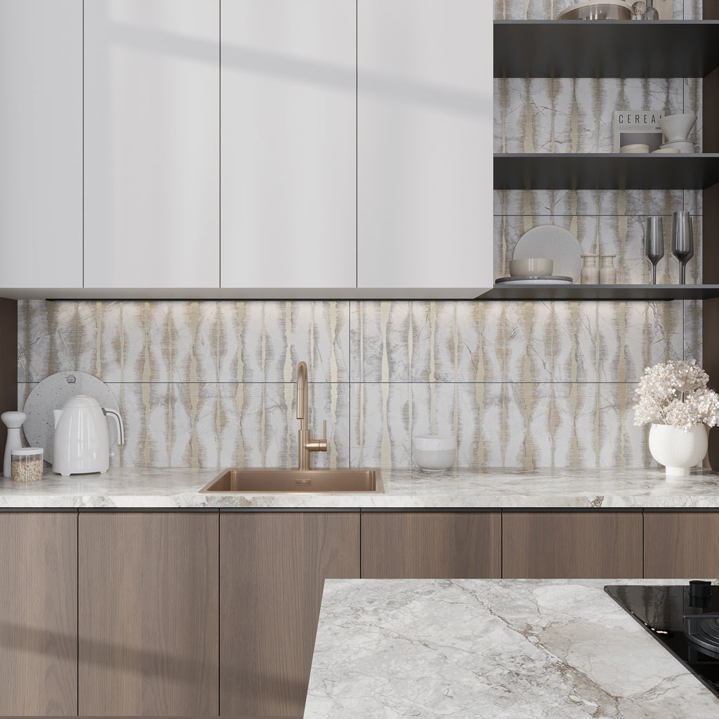 This tile has that “where did you get that?” appeal, blending modern texture with timeless neutrals. Every glance offers something new, from subtle veining to the rhythmic, wave-like texture that begs to be touched. It’s art for your walls—with just the right amount of shine to feel luxurious but not fussy.