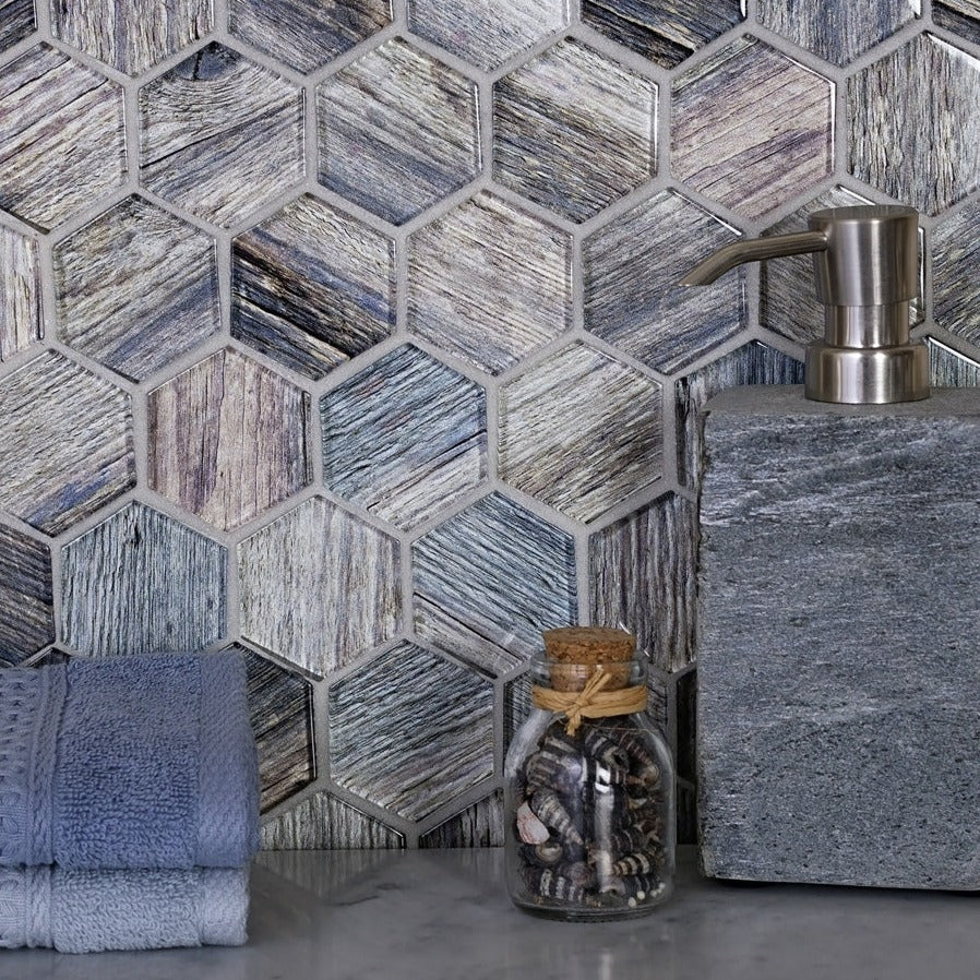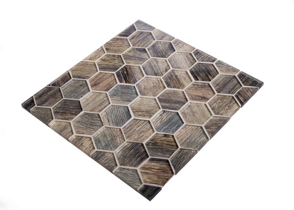 The smooth, glossy finish enhances hexagon glass mosaic tile’s ability to reflect light, creating a brighter and airy feel. It is especially wonderful as a hexagon tile backsplash kitchen design, where its color variation and grain pattern pair with any style of cabinets and countertops. In the bathroom, it brings the appeal of the outdoors in, creating a serene oasis when used on shower walls, vanity backsplash, or behind the bathtub, complementing both traditional and modern fittings. The wood-look finish lends an earthy touch, where it shines in the entryway, living room, or any interior spot that deserves a makeover.