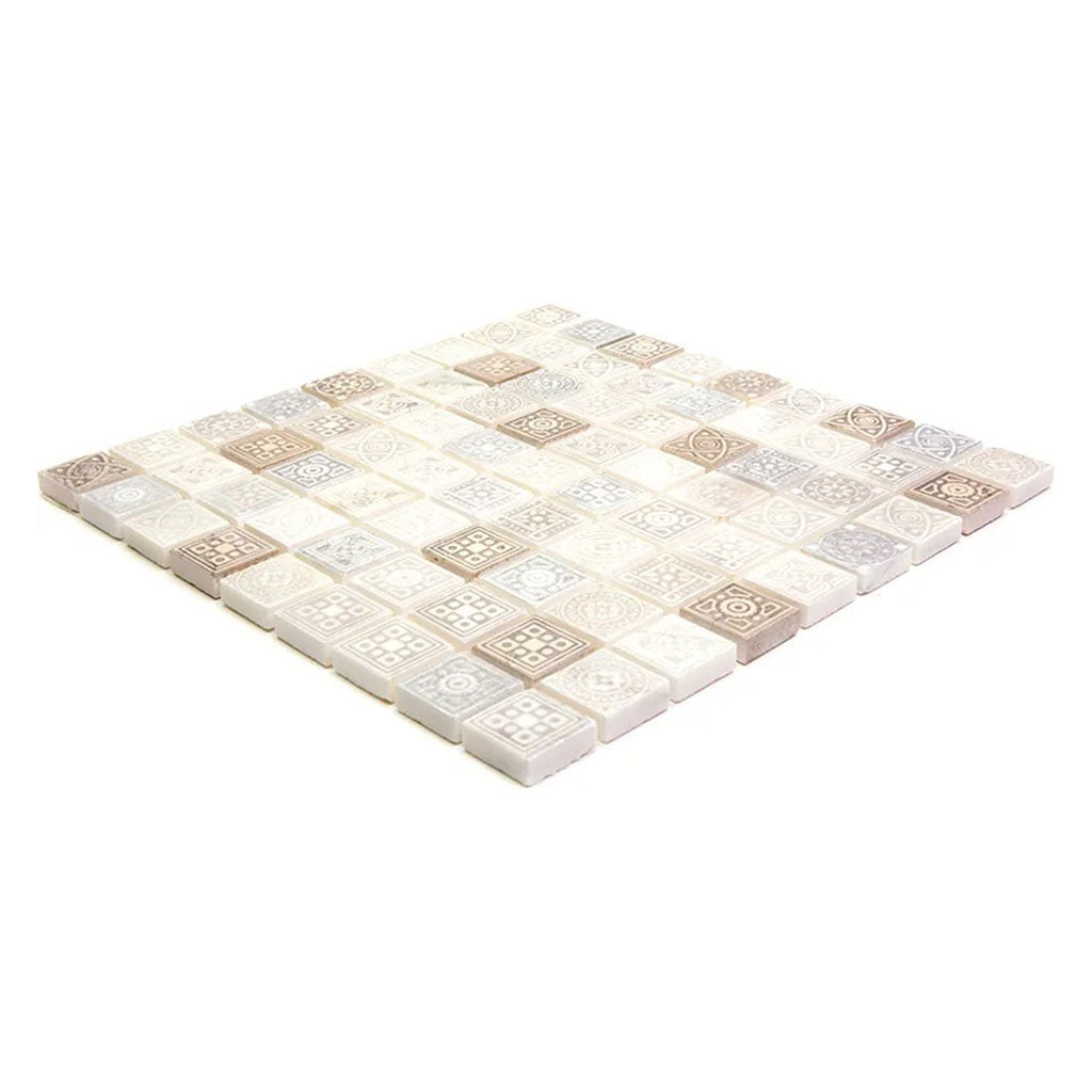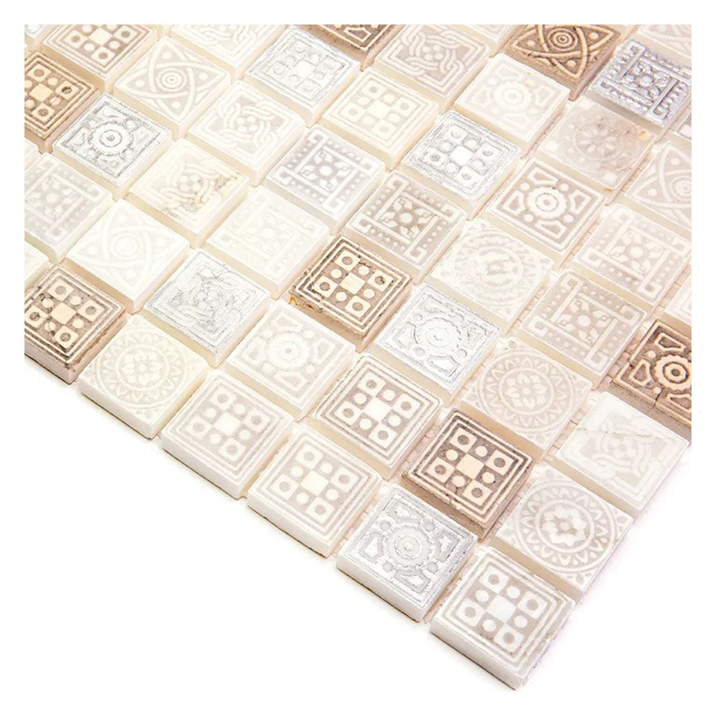 Soft and serene, this mosaic tile showcases a palette of neutral creams and earthy tones with delicate, decorative patterns etched across each chip. The textured, foiled surface adds a subtle shimmer, making it an ideal choice for those seeking understated elegance. Perfect for creating calm and inviting spaces, this tile works beautifully in spa-like bathrooms, warm kitchen backsplashes, or even feature walls that need a touch of timeless style. The 1.2-inch chips feature an array of patterns, from intricate florals to geometric designs, ensuring a harmonious blend of detail and simplicity. Designed for indoor walls and low-traffic areas, its stone construction offers durability without compromising on aesthetics. This tile is a go-to for projects where subtle beauty and versatility are key.