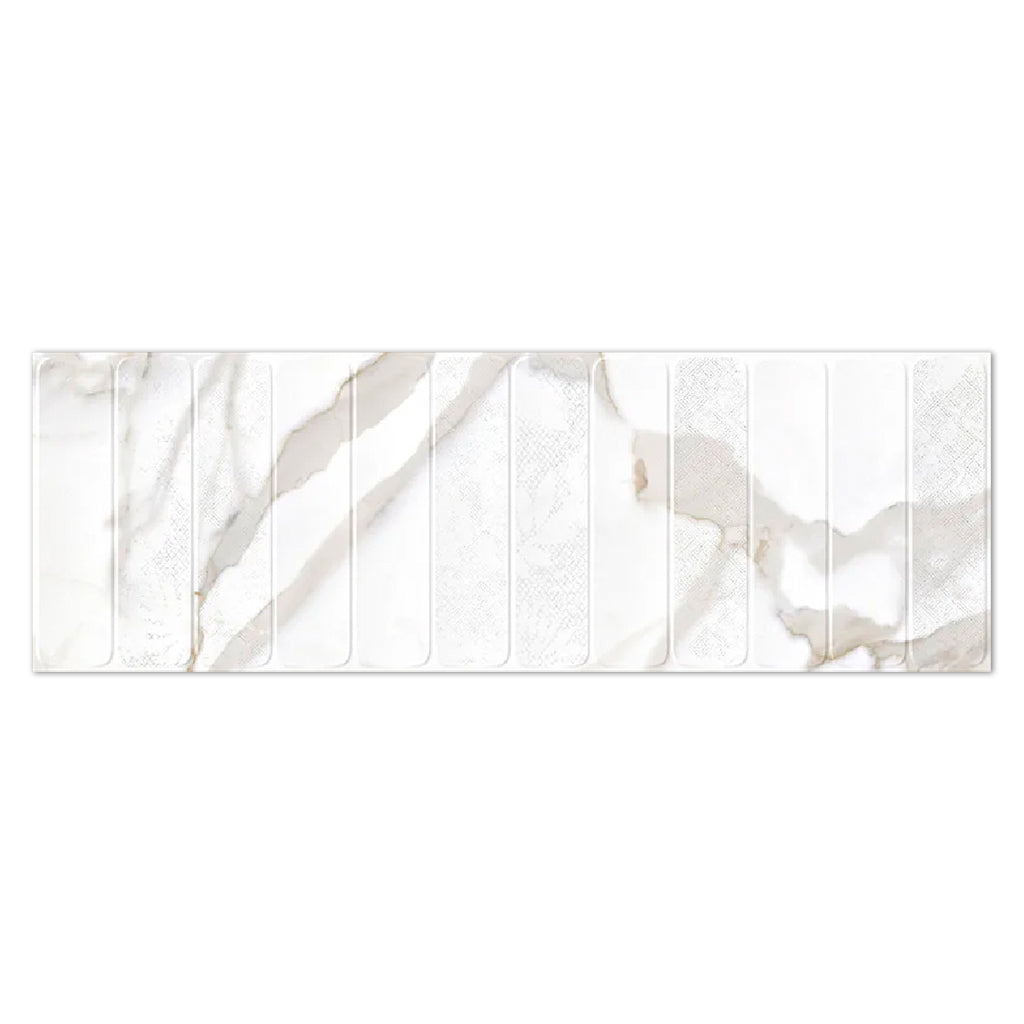 Subtle sophistication comes alive with soft white tones, delicate gold veining, and intricate textured panels that create a refined, luxurious look. The elongated 16"x48" format enhances modern spaces by emphasizing clean lines and seamless design, while the matt finish lends a soft, understated elegance. With 12 unique porcelain faces, every piece offers visual variety that feels custom-made for your walls.