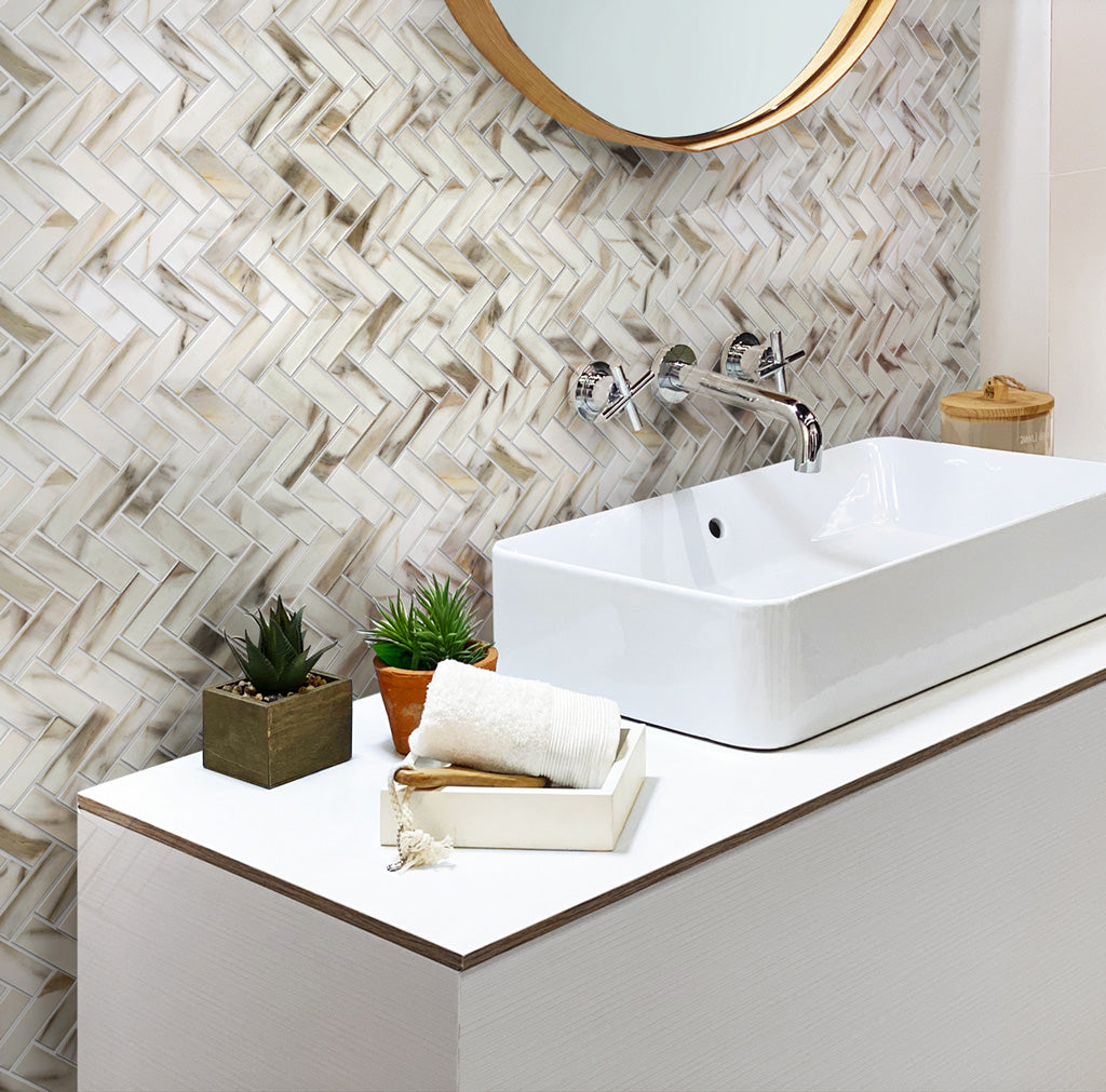 If you’re looking for a living room tile to set off your design scheme, this glass mosaic is your match. Much like real marble, it’s perfect for creating a gorgeous wall feature or fireplace surround with lasting flair. In the kitchen, marble-inspired herringbone tile is destined to add a touch of luxe to the backsplash. Pair with muted design elements and you have yourself a striking focal point!